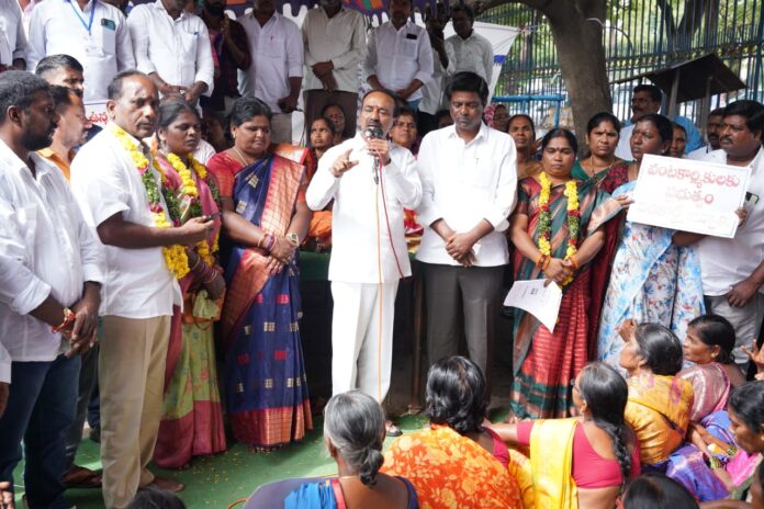 తెలంగాణ ప్రభుత్వ పాఠశాలల మధ్యాహ్న భోజన కార్మికులు చేస్తున్న ధర్నాలో మల్కాజ్ గిరి పార్లమెంట్ సభ్యులు ఈటల రాజేందర్ పాల్గొన్నారు. సొంత డబ్బులు పెట్టి పిల్లలకు వండి పెడుతుంటే వాటికి చెల్లించాల్సిన డబ్బులు ఐదారు నెలల తర్వాత గ్రాంట్ రూపంలో ఇవ్వడం దారుణమని ఈ సందర్భంగా ఆయన అభిప్రాయపడ్డారు. ప్రతినెల సరుకులకు పైసలు ఇవ్వాలన్న డిమాండ్ కు తమ సంపూర్ణ మద్దతు ప్రకటిస్తున్నామని తెలియజేశారు. ప్రభుత్వ పాఠశాలలో పనిచేస్తున్న వంట కార్మికులకు పదివేల రూపాయలు జీతభత్యము చెల్లింస్తామన్న ముఖ్యమంత్రి రేవంత్ రెడ్డి హామీని వెంటనే అమలు చేయాలని.. పెరిగిన ధరలకు అనుగుణంగా ఎప్పటికప్పుడు గుడ్లు, పాల ధరలను చెల్లించాలని డిమాండ్ చేశారు.