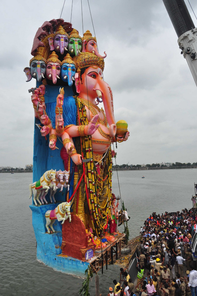 ఖైరతాబాద్ గణేష్ నిమజ్జనం పూర్తయింది.70 అడుగుల సప్తముఖ మహాశక్తి గణపతి భక్తుల కోలాహలం మధ్య గంగమ్మ ఒడిలోకి చేరుకున్నాడు. స్వామి నిమజ్జన్నాన్ని వీక్షించేందుకు విచ్చేసిన లక్షలాది మంది భక్తులతో ట్యాంక్ బండ్ పరిసరాలు కిక్కిరిసిపోయాయి. వేలల్లో తరలివచ్చిన గణనాధుల విగ్రహాలను నిమజ్జనం చేసేందుకు భారీ ఏర్పాట్లు చేశారు. గ్రేటర్ పరిధిలో మొత్తం 71ప్రాంతాల్లో నిమజ్జనాలకు ఏర్పాట్లు చేయగా ఎక్కడా ట్రాఫిక్ ఇబ్బందులు తలెత్తకుండా దాదాపు 25వేల మంది పోలీసులు విధులు నిర్వర్తించారు.